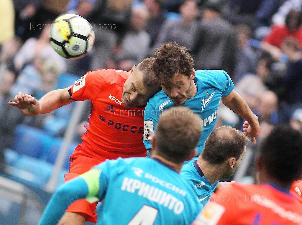 Чемпионат России по футболу. Матч между командами "Зенит" (Санкт-Петербург) и ЦСКА (Москва) прошел на стадионе "Санкт-Петербург". Игрок команды "Зенит" Доменико Кришито (в центре) и игрок команды ЦСКА Константин Кучаев (слева) во время матча.