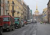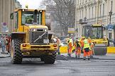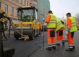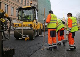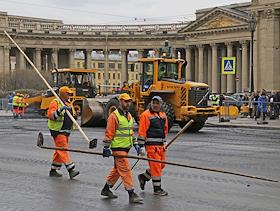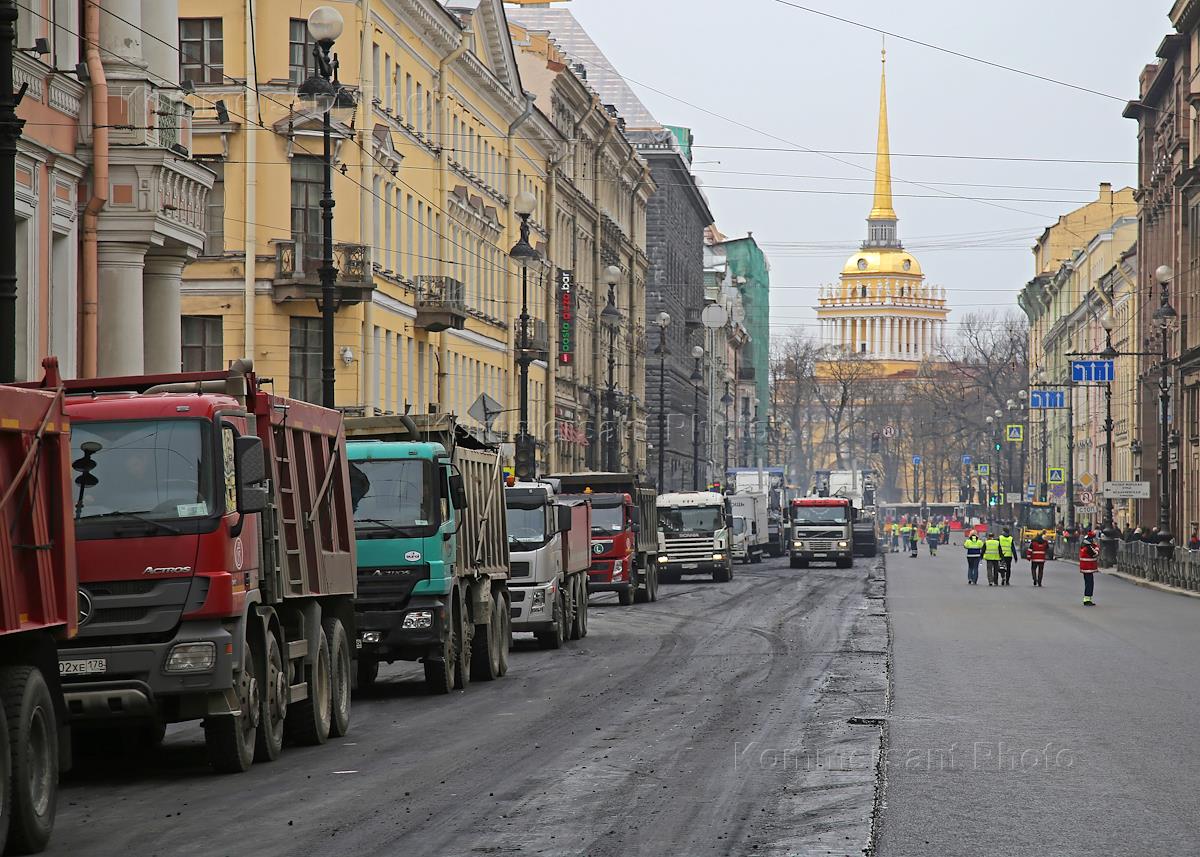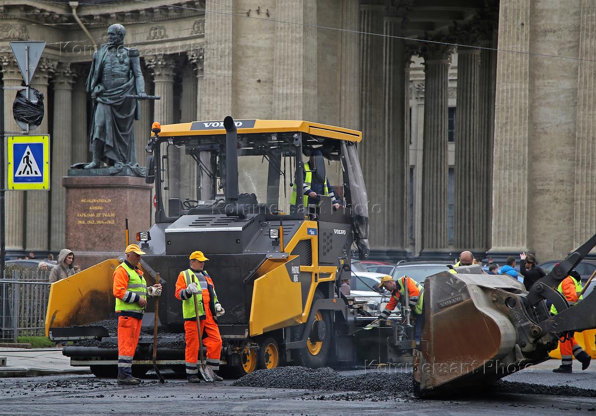 Ремонт Невского проспекта. Сотрудники ремонтно-дорожной организации и спецтехника во время укладки асфальта.