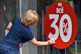 Жанровая фотография. Сотрудник магазина оформляет вывеску на витрине.