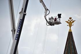 День международной солидарности трудящихся. Традиционное первомайское шествие профсоюзов на Красной площади. Телевизионный оператор во время работы.