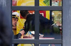 Репетиция Парада Победы. Военные моряки обедают в уличном кафе.