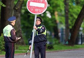 Репетиция Парада Победы. Сотрудники полиции устанавливают дорожные знаки.