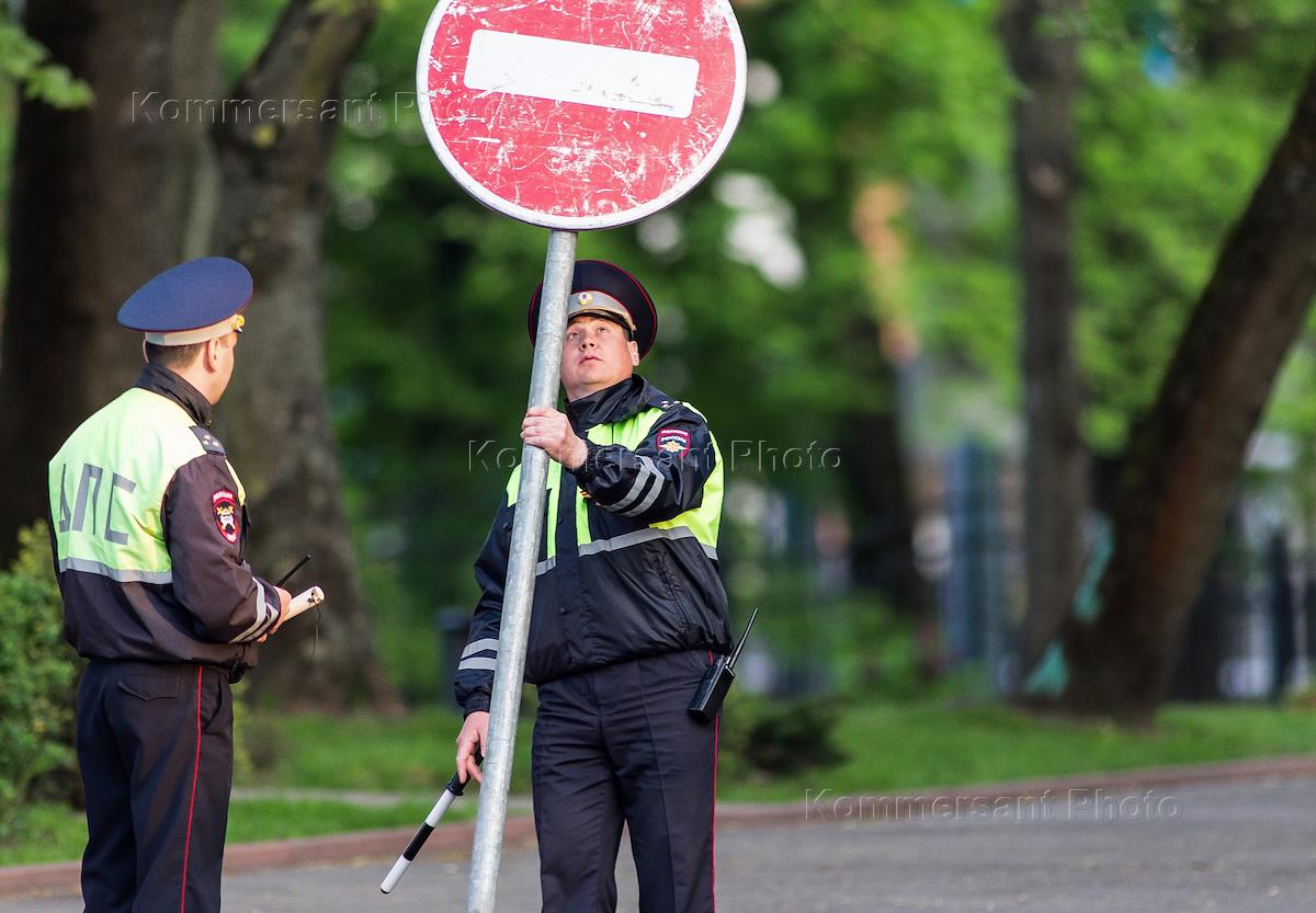 Репетиция Парада Победы. Сотрудники полиции устанавливают дорожные знаки.