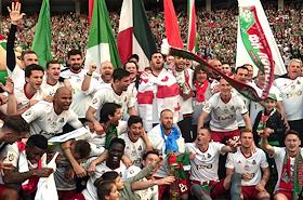 РОСГОССТРАХ Чемпионат России по футболу 2017/2018. 29-й тур. Матч между командами "Локомотив" (Москва) и "Зенит" (Санкт-Петербург) прошел на стадионе "РЖД Арена". Игроки команды "Локомотив" с Кубком Чемпионата России по футболу во время церемонии награждения.