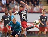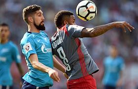 РОСГОССТРАХ Чемпионат России по футболу 2017/2018. 29-й тур. Матч между командами "Локомотив" (Москва) и "Зенит" (Санкт-Петербург) прошел на стадионе "РЖД Арена". Игрок команды "Зенит" Антон Заболотный (в центре) и игрок команды "Локомотив" Маринато Гилерме (справа) во время матча.