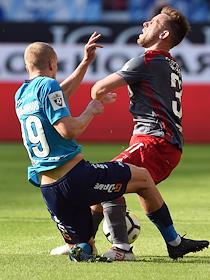 РОСГОССТРАХ Чемпионат России по футболу 2017/2018. 29-й тур. Матч между командами "Локомотив" (Москва) и "Зенит" (Санкт-Петербург) прошел на стадионе "РЖД Арена". Игрок команды "Зенит" Игорь Смольников (слева) и игрок команды "Локомотив" Мацей Рыбус (справа) во время матча.