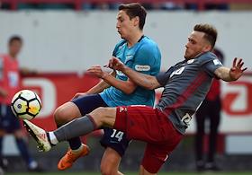 РОСГОССТРАХ Чемпионат России по футболу 2017/2018. 29-й тур. Матч между командами "Локомотив" (Москва) и "Зенит" (Санкт-Петербург) прошел на стадионе "РЖД Арена". Игрок команды "Зенит" Игорь Смольников (слева) и игрок команды "Локомотив" Антон Миранчук (справа) во время матча.