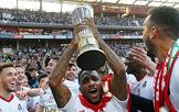 РОСГОССТРАХ Чемпионат России по футболу 2017/2018. 29-й тур. Матч между командами "Локомотив" (Москва) и "Зенит" (Санкт-Петербург) прошел на стадионе "РЖД Арена". Главный тренер команды "Локомотив" Юрий Семин (в центре), игроки команды "Локомотив" Игорь Денисов (слева) и Маринато Гилерме (справа) с Кубком Чемпионата России по футболу во время церемонии награждения.