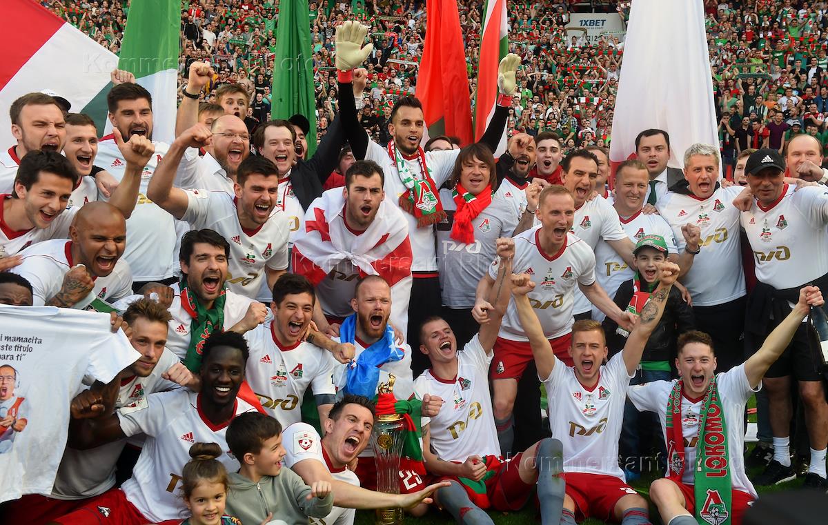 РОСГОССТРАХ Чемпионат России по футболу 2017/2018. 29-й тур. Матч между командами "Локомотив" (Москва) и "Зенит" (Санкт-Петербург) прошел на стадионе "РЖД Арена". Игроки команды "Локомотив" с Кубком Чемпионата России по футболу во время церемонии награждения.