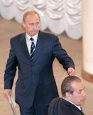 Президент России Владимир Путин (слева) и председатель Союза российских промышленников и предпринимателей Аркадий Вольский (справа) на XIV съезде Российского союза промышленников и предпринимателей (работодателей) в колонном зале Дома союзов.
