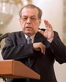 Председатель Союза российских промышленников и предпринимателей Аркадий Вольский (слева) и президент Торгово-промышленной палаты (ТПП) России Евгений Примаков (справа) на XIV съезде Российского союза промышленников и предпринимателей (работодателей) в колонном зале Дома союзов.