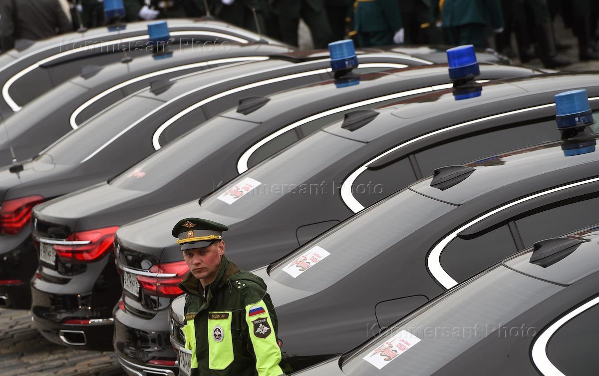 Генеральная репетиция военного парада, посвященного 73-й годовщине Победы в Великой Отечественной войне, прошла на Красной площади. Автомобили со спецсигналами на крыше на стоянке.