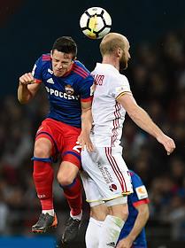 РОСГОССТРАХ Чемпионат России по футболу 2017/2018. 29-й тур. Матч между командами ПФК "ЦСКА" (Москва) и "Арсенал" (Тула) прошел на стадионе "ВЭБ-Арена". Игрок команды ЦСКА Марио Фернандес (слева) и игрок команды "Арсенал" Артем Дзюба (справа) во время матча.