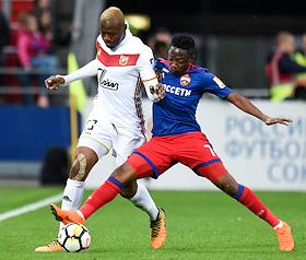 РОСГОССТРАХ Чемпионат России по футболу 2017/2018. 29-й тур. Матч между командами ПФК "ЦСКА" (Москва) и "Арсенал" (Тула) прошел на стадионе "ВЭБ-Арена". Игрок команды ЦСКА Константин Кучаев (слева) и игрок команды "Арсенал" Эванс Кангва (справа) во время матча.