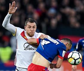 РОСГОССТРАХ Чемпионат России по футболу 2017/2018. 29-й тур. Матч между командами ПФК "ЦСКА" (Москва) и "Арсенал" (Тула) прошел на стадионе "ВЭБ-Арена". Игрок команды ЦСКА Сергей Игнашевич (слева) и игрок команды "Арсенал" Артем Дзюба (справа) во время матча.