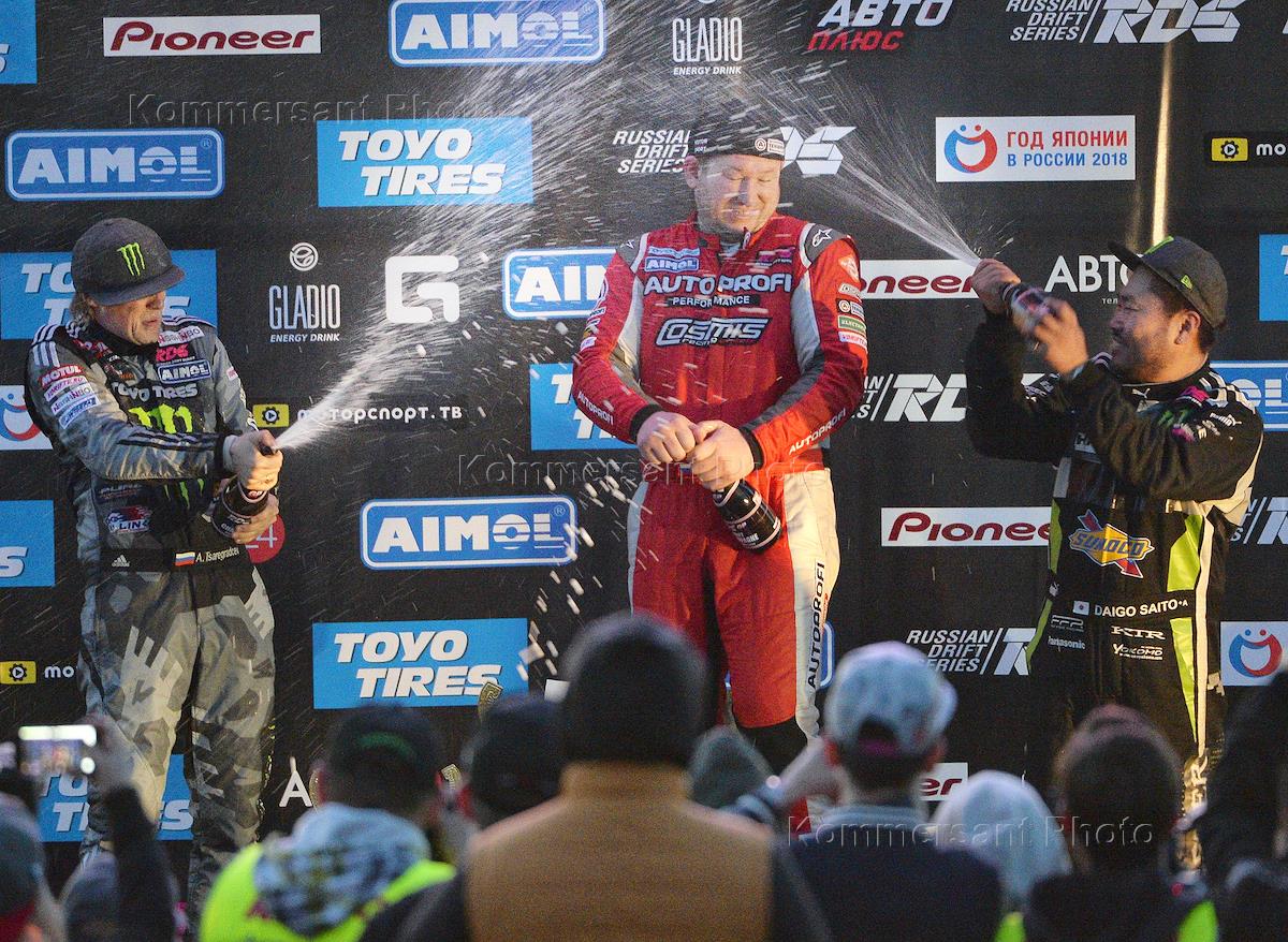 Чемпионат по дрифту RDS 2018 на автодроме Moscow Raceway. Слева направо: победители Аркадий Цареградцев, Евгений Лосев и Дайго Сайто во время церемонии награждения.