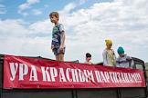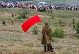 Реконструкция боя времен Великой Отечественной войны на фестивале "Высота Горная". Надпись на плакате "Ура Красным партизанам!".