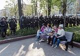 Несанкционированная акция протеста сторонников оппозиционера Алексея Навального "Он нам не царь" прошла на Пушкинской площади. Отдыхающие в сквере и цепочка сотрудников правоохранительных органов во время акции.