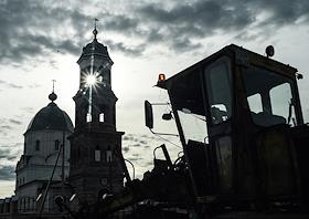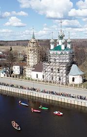 Виды села Холуй во время весеннего разлива реки Теза. Храмовый комплекс - Троицкая и Введенская церкви. Акция молодых художников по возрождению древней традиции села Холуй – расписывать лодки и весла, использующиеся во время весеннего разлива реки Теза. Местные жители во время праздничного спуска лодок на воду.