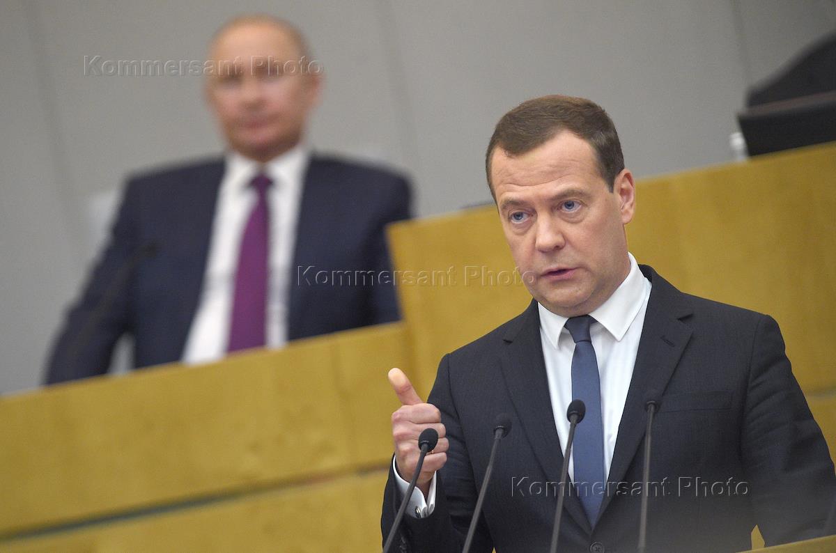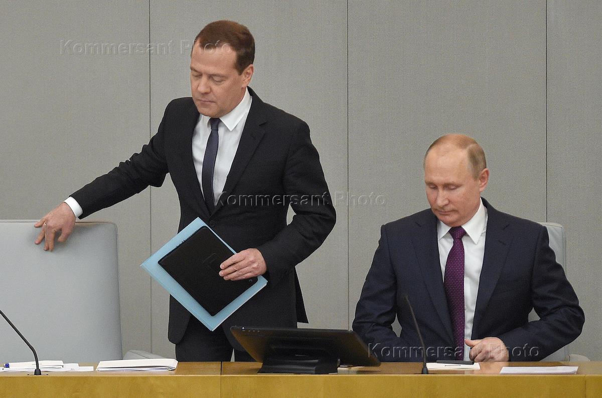 Пленарное заседание Государственной думы (ГД) России, на котором состоялось рассмотрение кандидатуры Дмитрия Медведева на должность председателя правительства России. Исполняющий обязанности председателя правительства России Дмитрий Медведев (слева) и президент России Владимир Путин (справа) во время заседания.