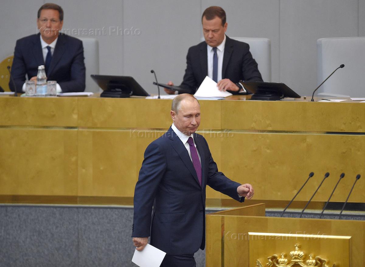 Пленарное заседание Государственной думы (ГД) России, на котором состоялось рассмотрение кандидатуры Дмитрия Медведева на должность председателя правительства России. Президент России Владимир Путин во время заседания.