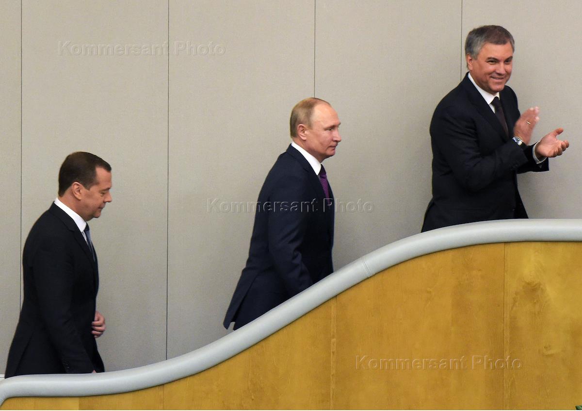 Пленарное заседание Государственной думы (ГД) России, на котором состоялось рассмотрение кандидатуры Дмитрия Медведева на должность председателя правительства России. Справа налево: исполняющий обязанности председателя правительства России Дмитрий Медведев, президент России Владимир Путин и председатель ГД России Вячеслав Володин во время заседания.