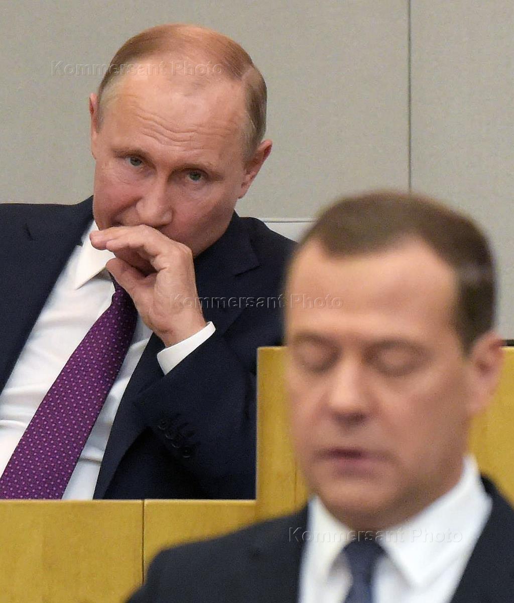 Пленарное заседание Государственной думы (ГД) России, на котором состоялось рассмотрение кандидатуры Дмитрия Медведева на должность председателя правительства России. Исполняющий обязанности председателя правительства России Дмитрий Медведев (слева) и президент России Владимир Путин (справа) во время заседания.