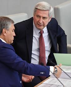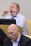 Пленарное заседание Государственной думы (ГД) России. Член комитета ГД России по транспорту и строительству Александр Старовойтов (в центре) и член комитета ГД России по экологии и охране окружающей среды Владимир Драчев (справа) во время заседания.