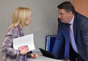 Пленарное заседание Государственной Думы (ГД) России. Председатель комитета ГД России по обороне Владимир Шаманов (слева) и член комитета ГД России по экономической политике, промышленности, инновационному развитию и предпринимательству Альфия Когогина (справа) перед началом заседания.