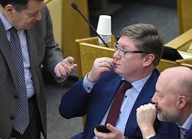 Пленарное заседание Государственной думы (ГД) России. Член Комитета ГД России по информационной политике, информационным технологиям и связи Вадим Деньгин (слева) и первый заместитель председателя Комитета ГД по контролю и Регламенту Александр Курдюмов (справа) перед началом заседания.