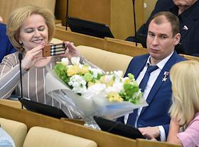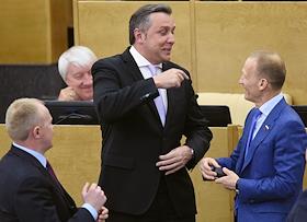 Пленарное заседание Государственной думы (ГД) России. Слева направо: член комитета ГД России по экологии и охране окружающей среды Владимир Драчев, член комитета ГД России по труду, социальной политике и делам ветеранов Ольга Павлова, член комитета ГД России по бюджету и налогам Дмитрий Юрков перед началом заседания.