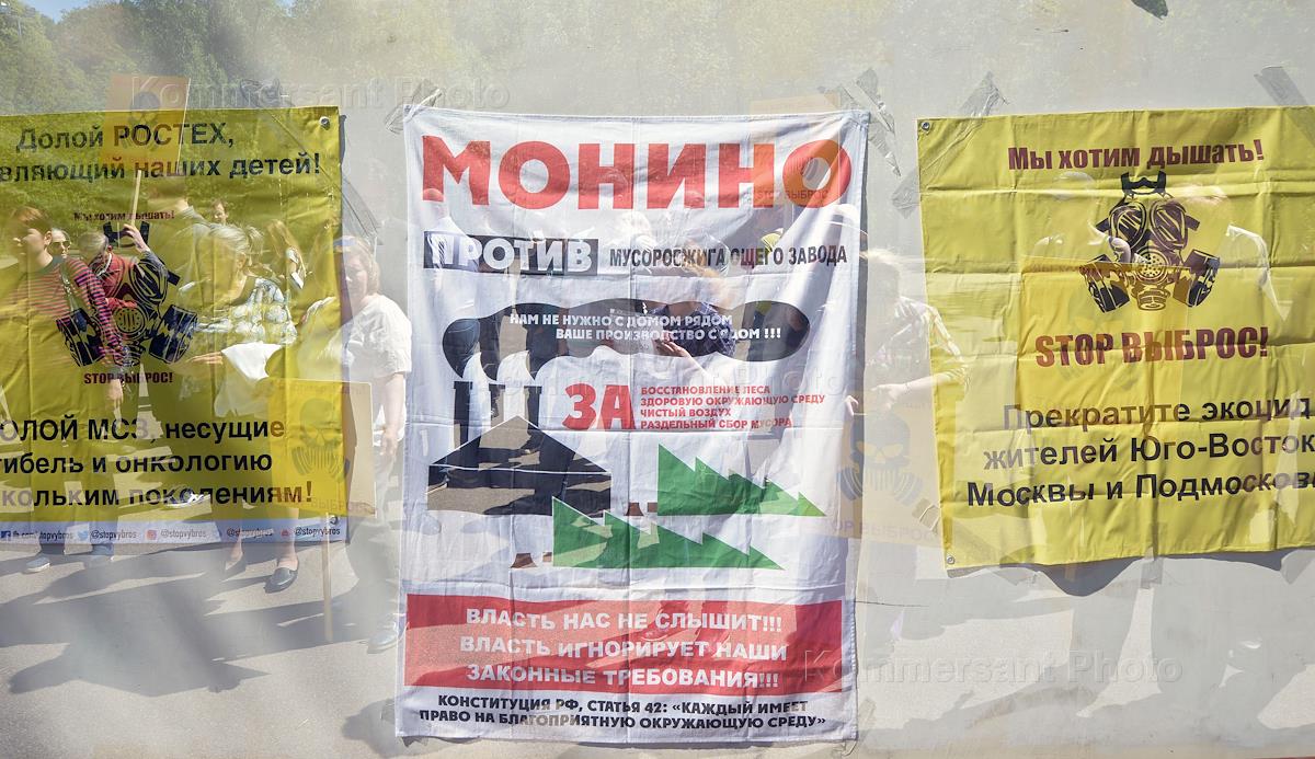 Митинг жителей Москвы и Московской области против строительства мусоросжигательных заводов и расширения свалок в Московской области прошел в гайд-парке "Сокольники". Участники с плакатами во время митинга.