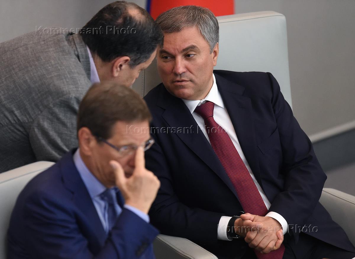 Пленарное заседание Государственной думы (ГД) России. Справа налево: председатель ГД России Вячеслав Володин, председатель комитета ГД России по бюджету и налогам Андрей Макаров и первый заместитель председателя ГД России Александр Жуков во время заседания.