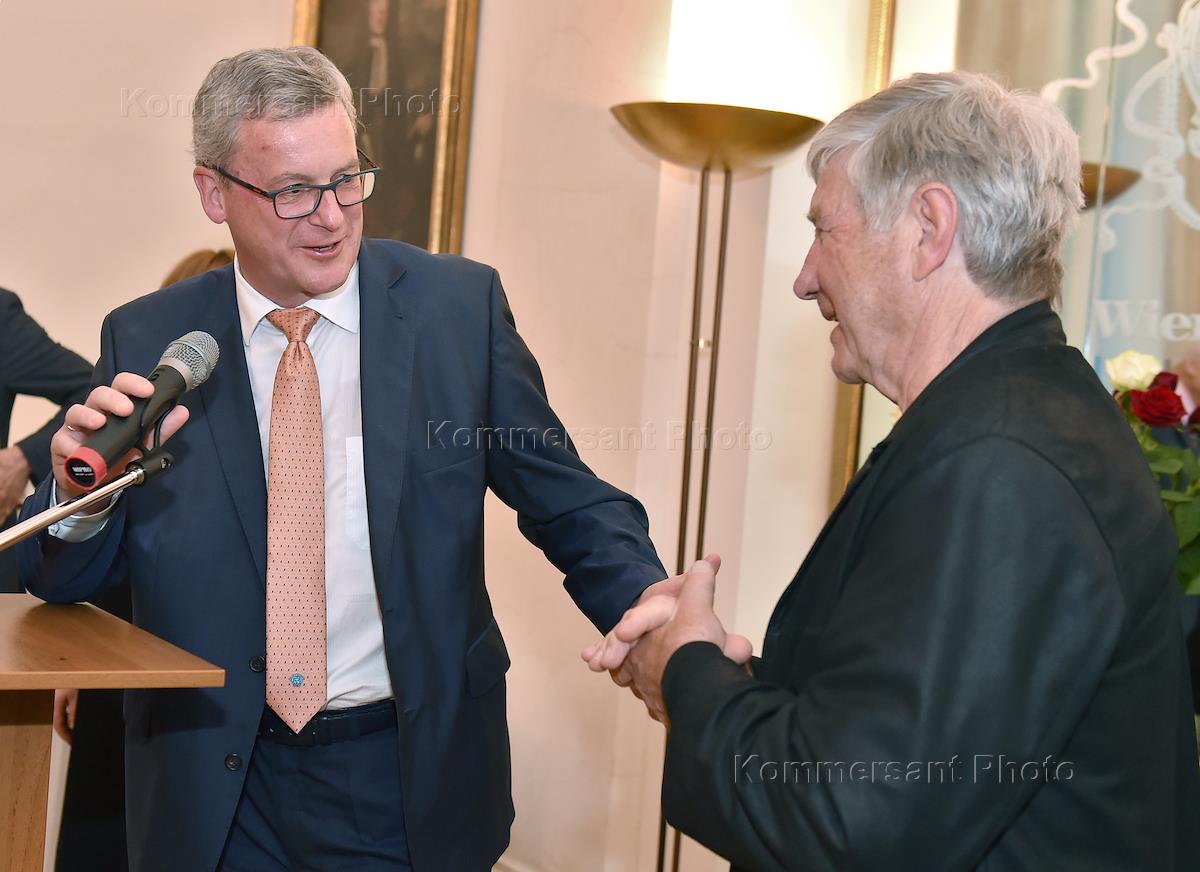 Официальный прием в Посольстве Австрии в честь скорого открытия выставки "Вадим Космачёв. Дыхание скульптуры", на котором будут представлены документальный фильм доктора Йоханна Мартэ (атташе по культуре посольства Австрии в Москве 1974–1982гг.) и одно из произведений экспозиции. Посол Австрии в России доктор Йоханнес Айгнер во время приема.