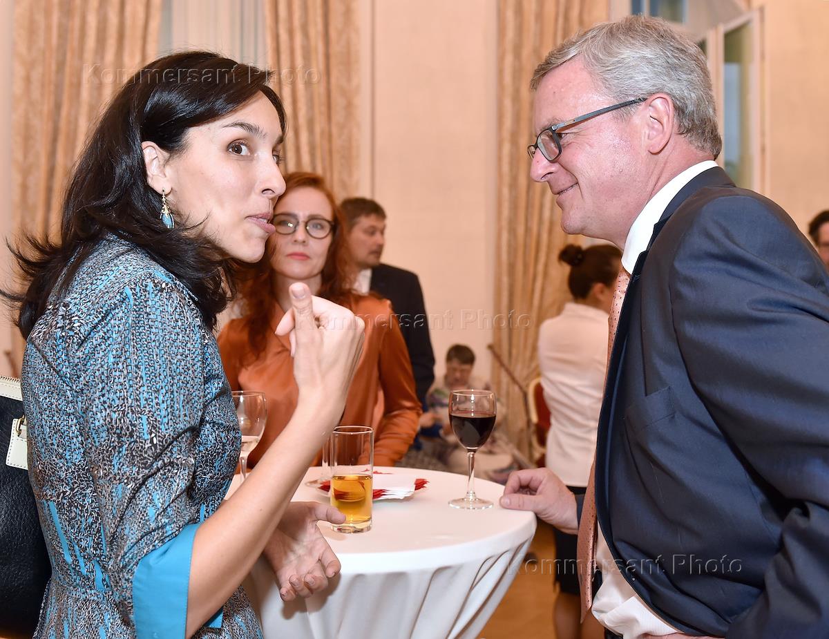 Официальный прием перед открытием выставки "Вадим Космачёв. Дыхание скульптуры" прошел в Посольстве Австрии. Основатель Центра современного искусства "Винзавод", советник министра культуры России Софья Троценко (слева) и посол Австрии в России доктор Йоханнес Айгнер (справа) во время приема.