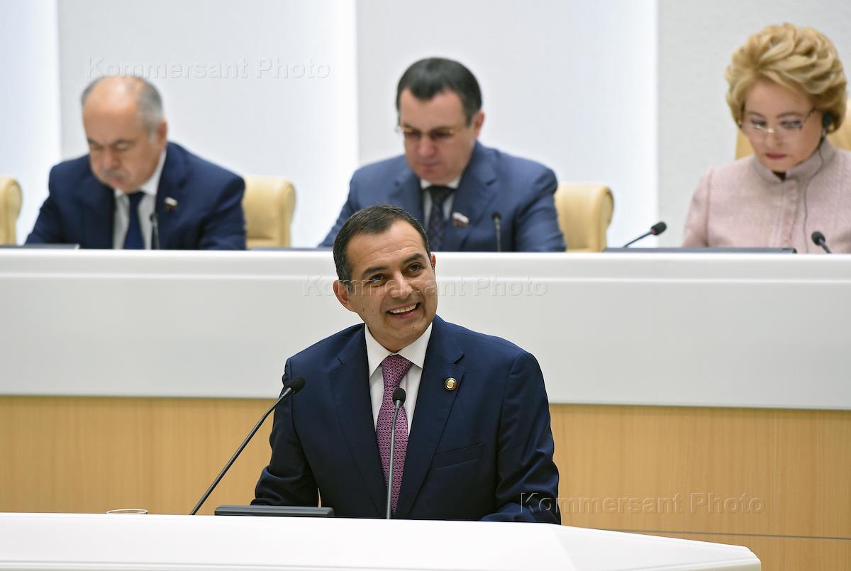 Заседание Совета Федерации (СФ) России. Председатель Палаты сенаторов Генерального конгресса Мексики Эрнесто Хавьер Кордеро Арройо во время заседания.