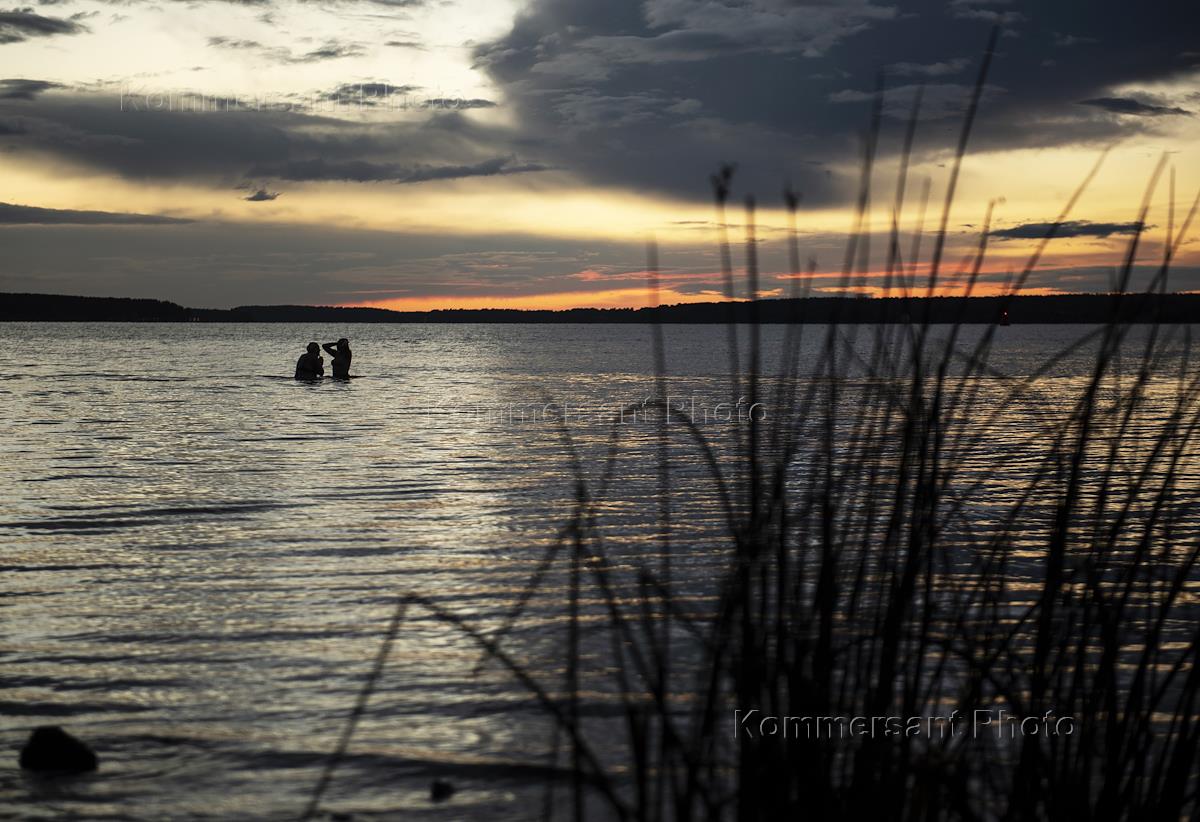 Жанровая фотография. Люди купаются реке Волге. Угличское водохранилише.