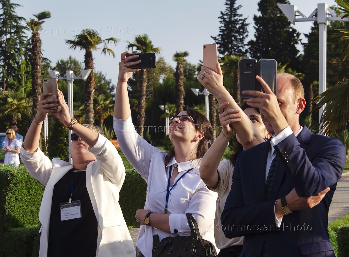Рабочая поездка президента России Владимира Путина в Сочи. День пятый. Жанровая фотография. Группа людей снимает на смартфоны.