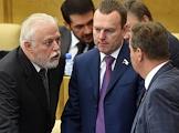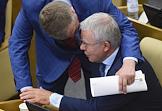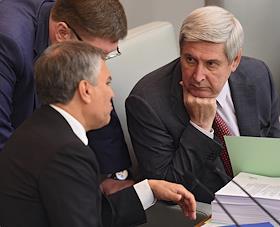 Пленарное заседание Государственной думы (ГД) России. Председатель комитета ГД России по образованию и науке Вячеслав Никонов (слева) и член комитета ГД России по финансовому рынку Алексей Изотов (в центре) во время заседания.
