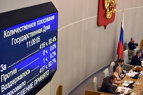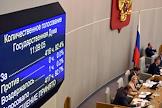 Пленарное заседание Государственной думы (ГД) России. Электронное табло с результатами голосования депутатов ГД России в зале заседаний.