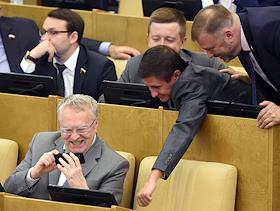 Пленарное заседание Государственной думы (ГД) России. Лидер Либерально-демократической партии России (ЛДПР) Владимир Жириновский (слева), член Комитета ГД по информационной политике, информационным технологиям и связи Вадим Деньгин (второй справа) и заместитель председателя комитета ГД России по Регламенту и организации работы ГД России Александр Курдюмов (справа) во время заседания.