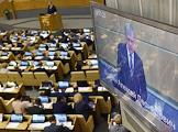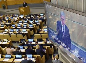Пленарное заседание Государственной думы (ГД) России. Кандидат на пост председателя Счетной палаты России, председатель совета фонда "Центр стратегических разработок" Алексей Кудрин (на экране) во время утверждения своей кандидатуры на думском заседании.