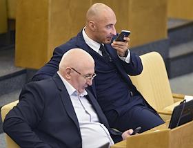 Пленарное заседание Государственной думы (ГД) России. Член комитета ГД России по физической культуре, спорту, туризму и делам молодежи Мурат Хасанов (слева) и член комитета ГД России по природным ресурсам, собственности и земельным отношениям Алексей Воевода (справа) во время заседания.