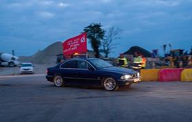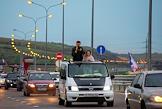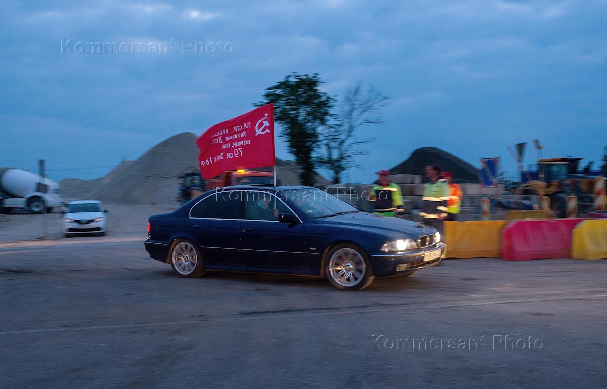 Начало автомобильного движения по Крымскому мосту. Автомобиль с красным флагом во время движения.