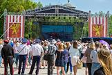 Начало автомобильного движения по Крымскому мосту. Мужчины рядом с транспарантом "Крым. Россия. Навсегда".