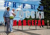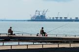 Начало автомобильного движения по Крымскому мосту. Рыбаки с удочками на пирсе во время рыбалки вблизи порта.