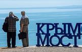 Начало автомобильного движения по Крымскому мосту. Мужчины на набережной возле рекламной конструкции "Крымский Мост", выполненной из объемных букв.