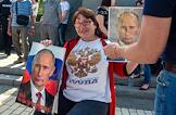 Начало автомобильного движения по Крымскому мосту. Женщина в майке с гербом России и портретом президента России Владимира Путина среди зрителей.