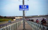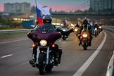 Начало автомобильного движения по Крымскому мосту. Колонна байкеров с флагами России перед началом движения.