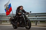 Начало автомобильного движения по Крымскому мосту. Лидер мотоклуба "Ночные волки" Александр "Хирург" Залдостанов с флагом России во время движения по Крымскому мосту.